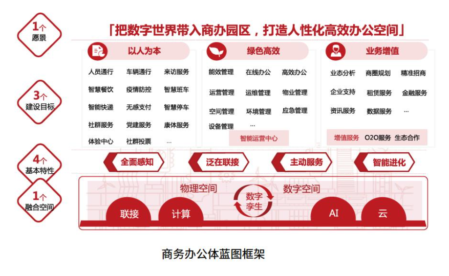 建設目標,則可以結合商辦特點,把如何以人為本、綠色高效、業務增值在商辦園區展開設計;同樣,全面感知、泛在聯接、主動服務和智能進化 4個基本特征,1個融合空間等內容,作為支撐的基礎,可結合商辦園區的特點,在技術實現層面加以詳細規劃。