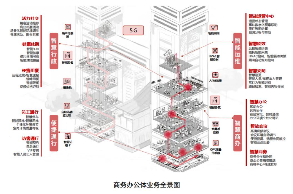 從用戶旅程的視角,圍繞以人為本、綠色高效和業務增值的目標,分別從便捷通行、智慧商辦、智慧行政和智慧運維幾個維度,勾勒商辦園區的智慧化場景和服務設計(如圖所示)。
